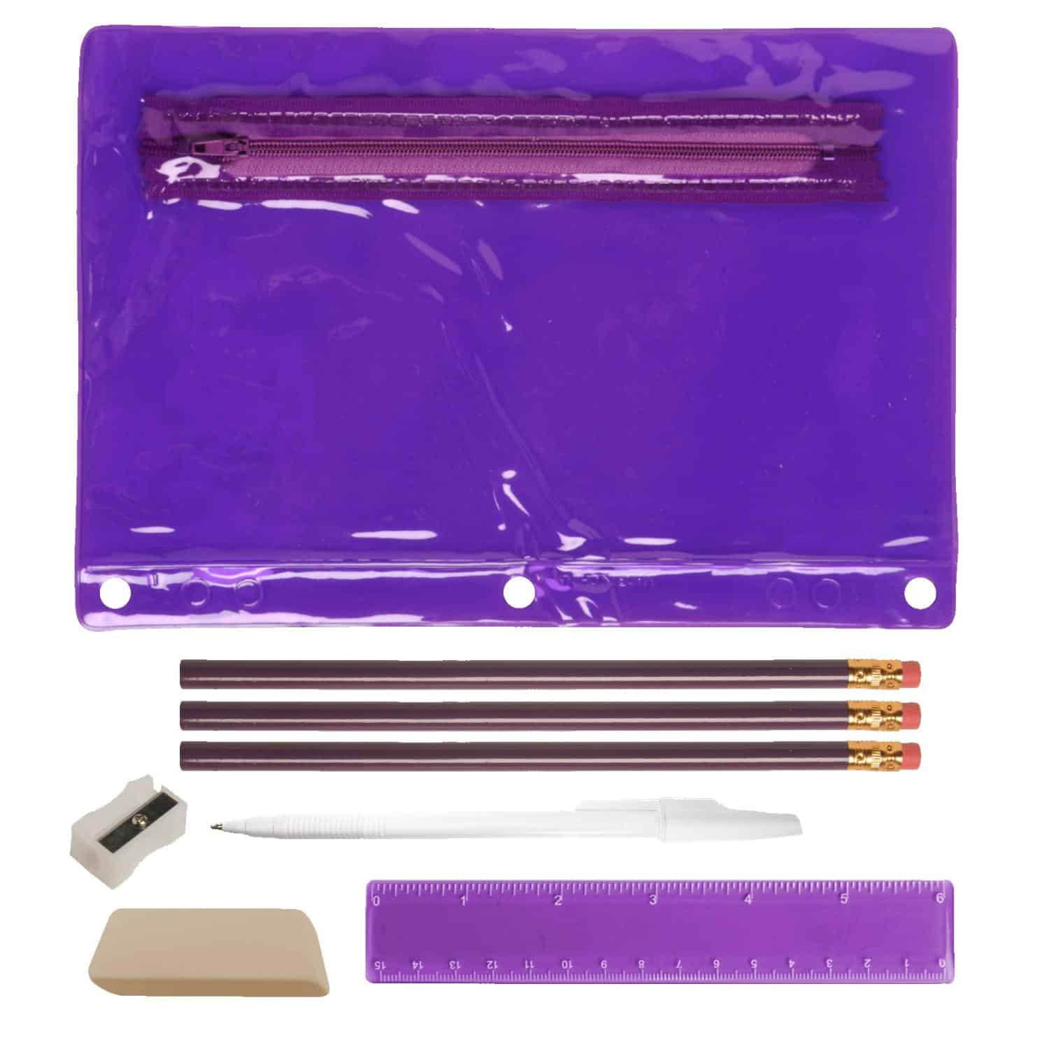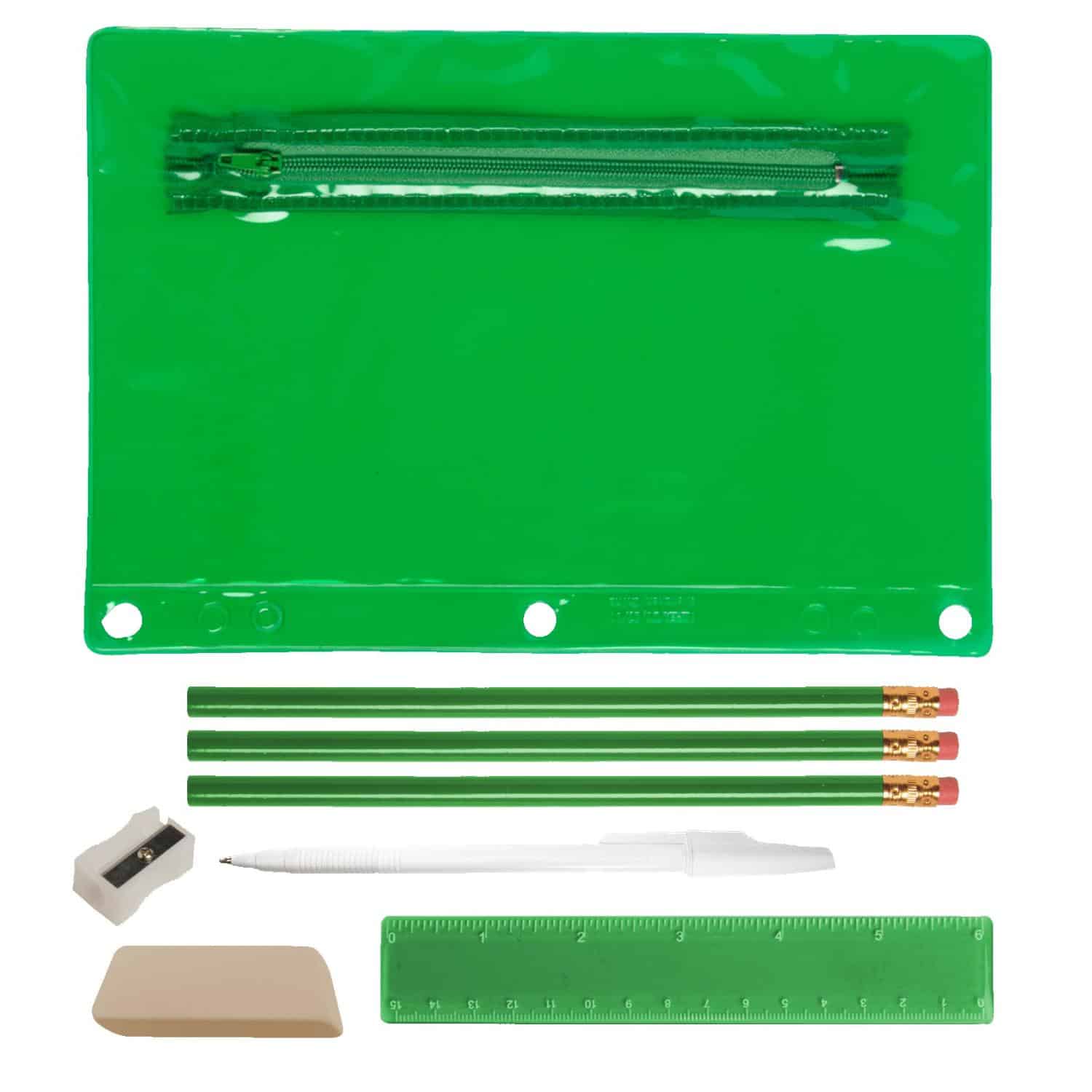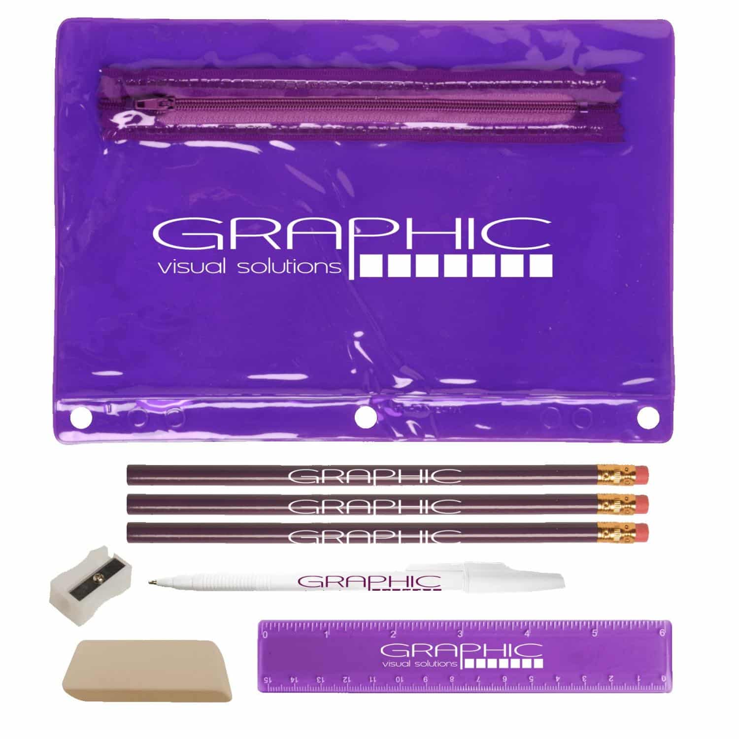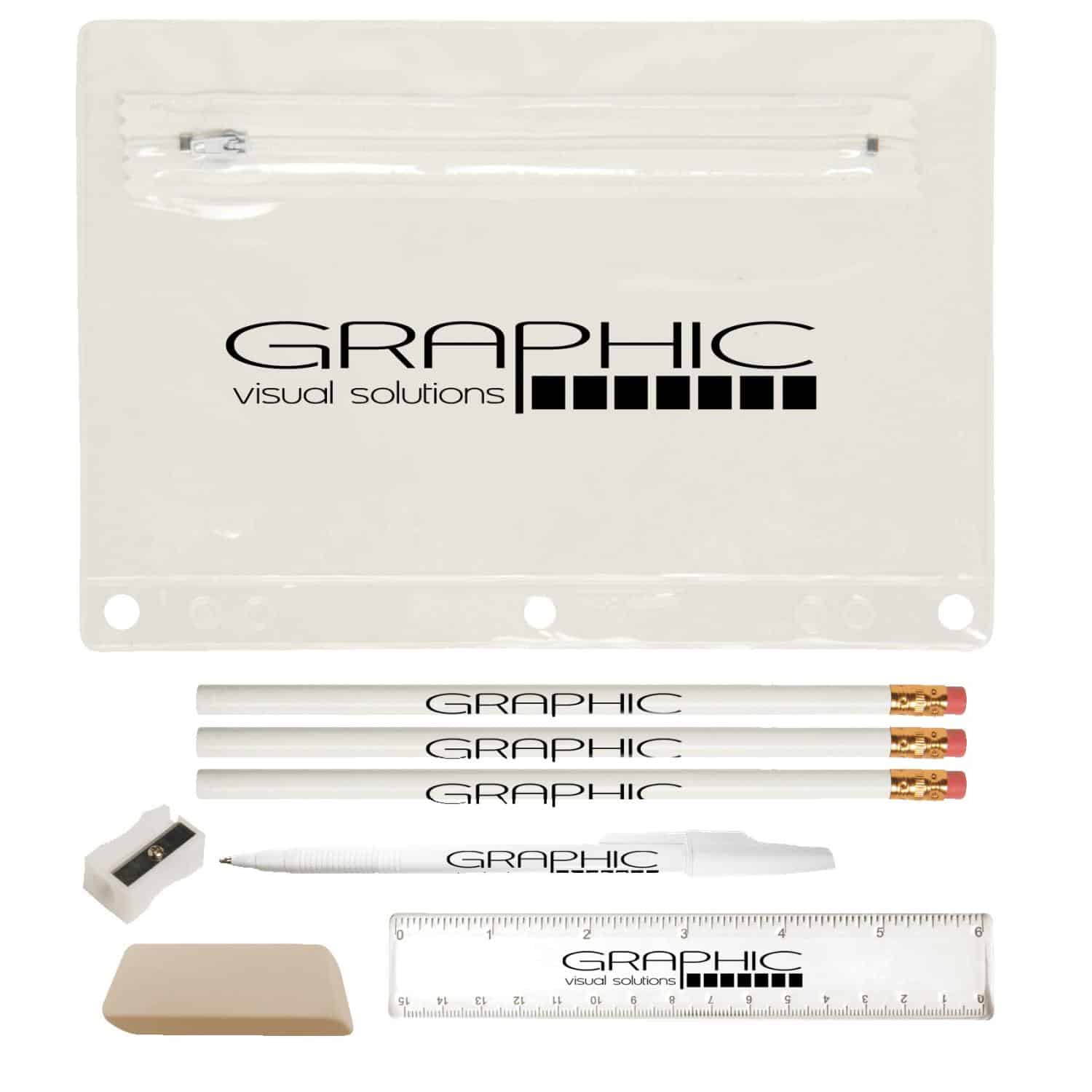 This school kit includes: 3-Jo-Bee Miser Round Pencils, 1-Competitor Stick Pen, 1-Jumbo Eraser without imprint, 1-6″ Plastic Ruler, and 1-White pencil sharpener without imprint. 6 1/4″ H x 9 1/4″ W