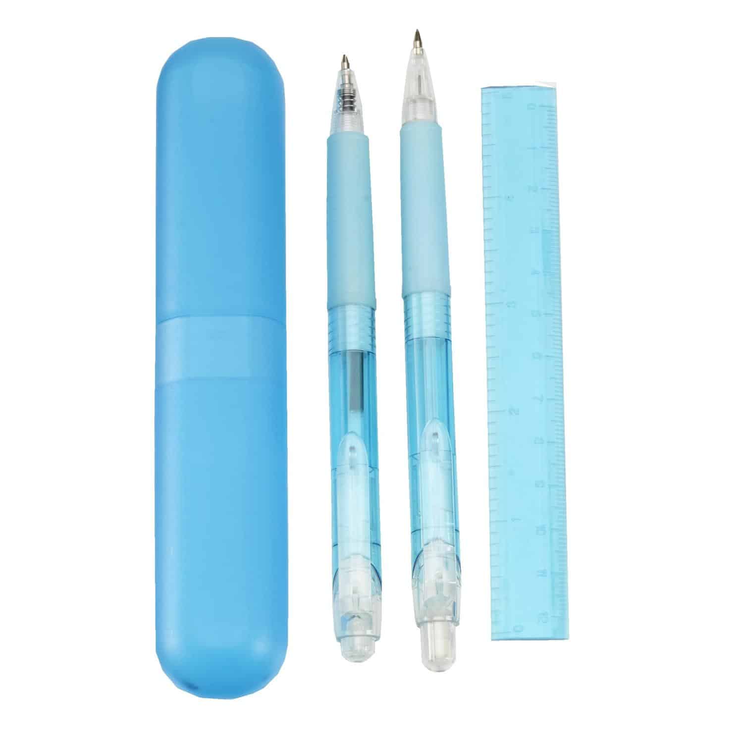 Compact frosted case contains transparent matching mechanical pencil, pen and 5″ ruler. Mechanical pencil includes .5mm lead with covered eraser and rubber grip. Pen features matching rubber grip with black medium point ink. 1 1/8″ H x 6″ W x 7/8″ D