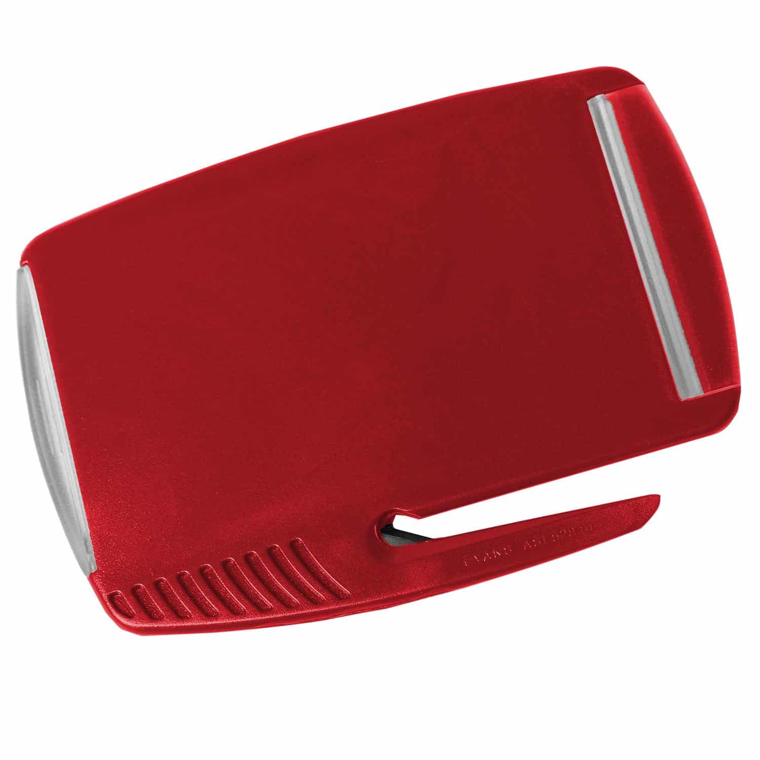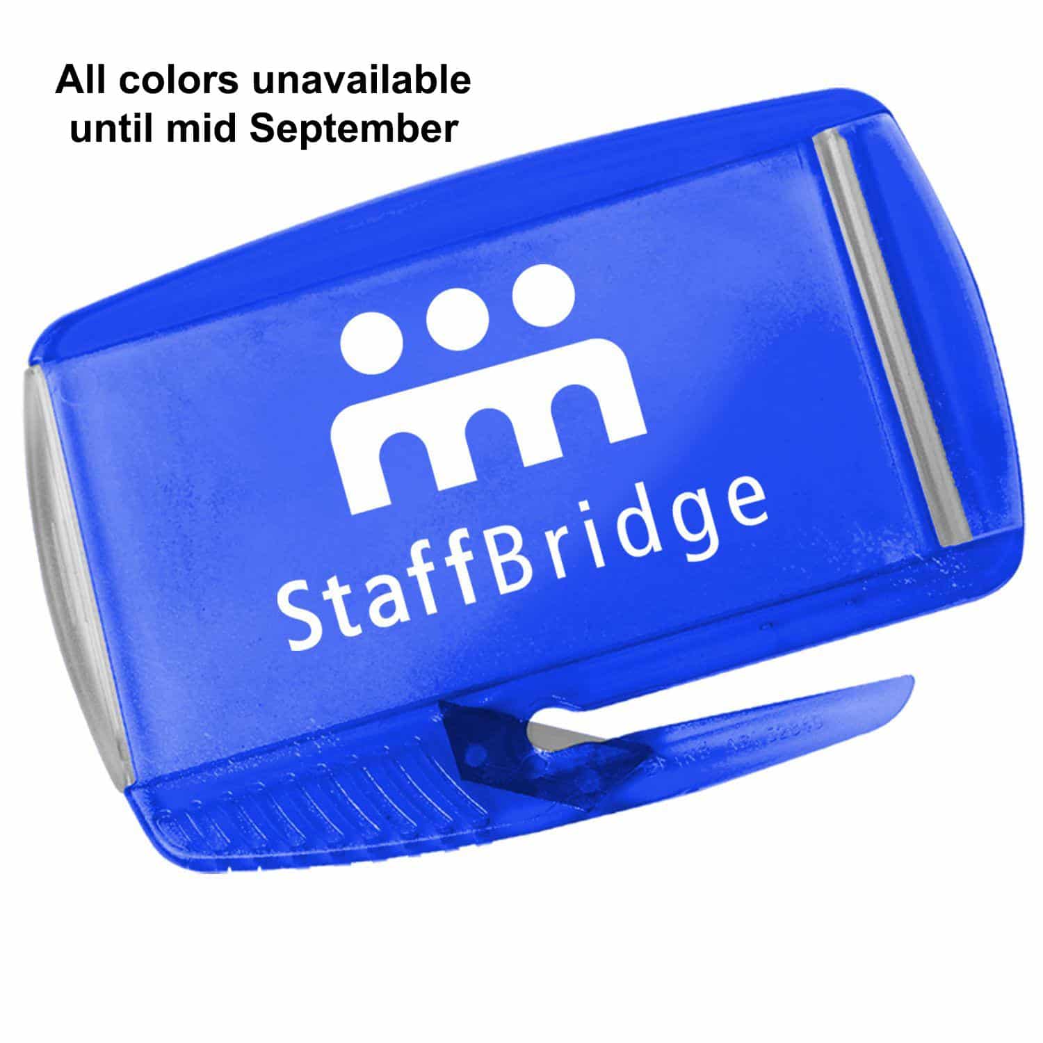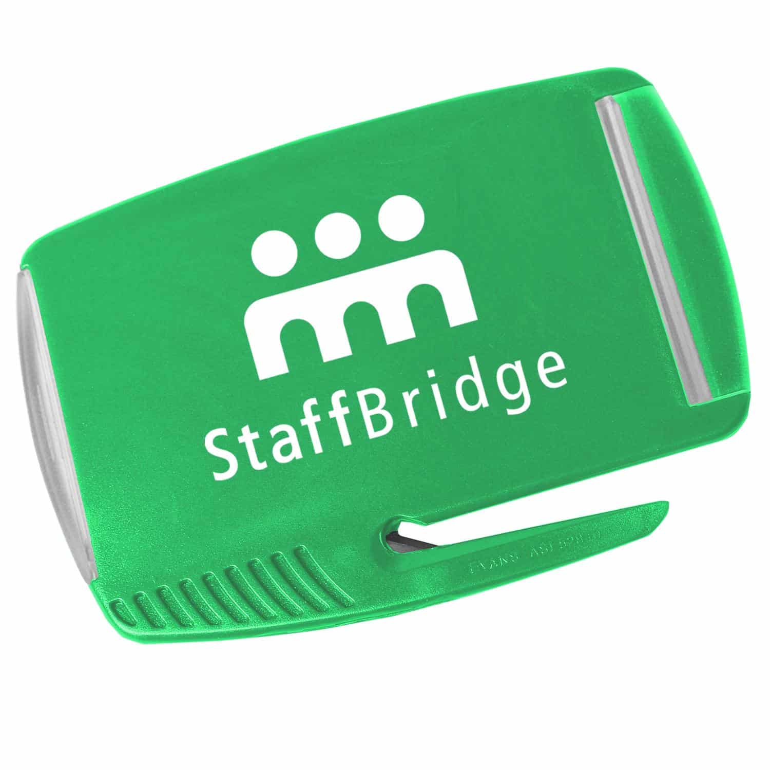 Tucked hinged clear cover holds standard business card or insertable message card. Features slitter with protective steel blade for opening envelopes and curved tip assists in removing staples. Comes with large imprint area. 3 1/16″ H x 4 3/8″ W x 1/8″ D