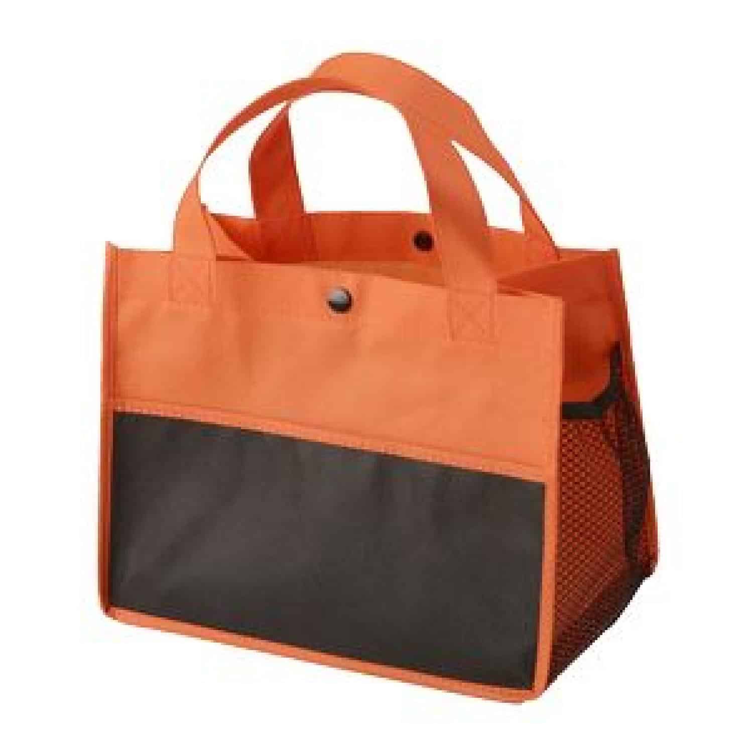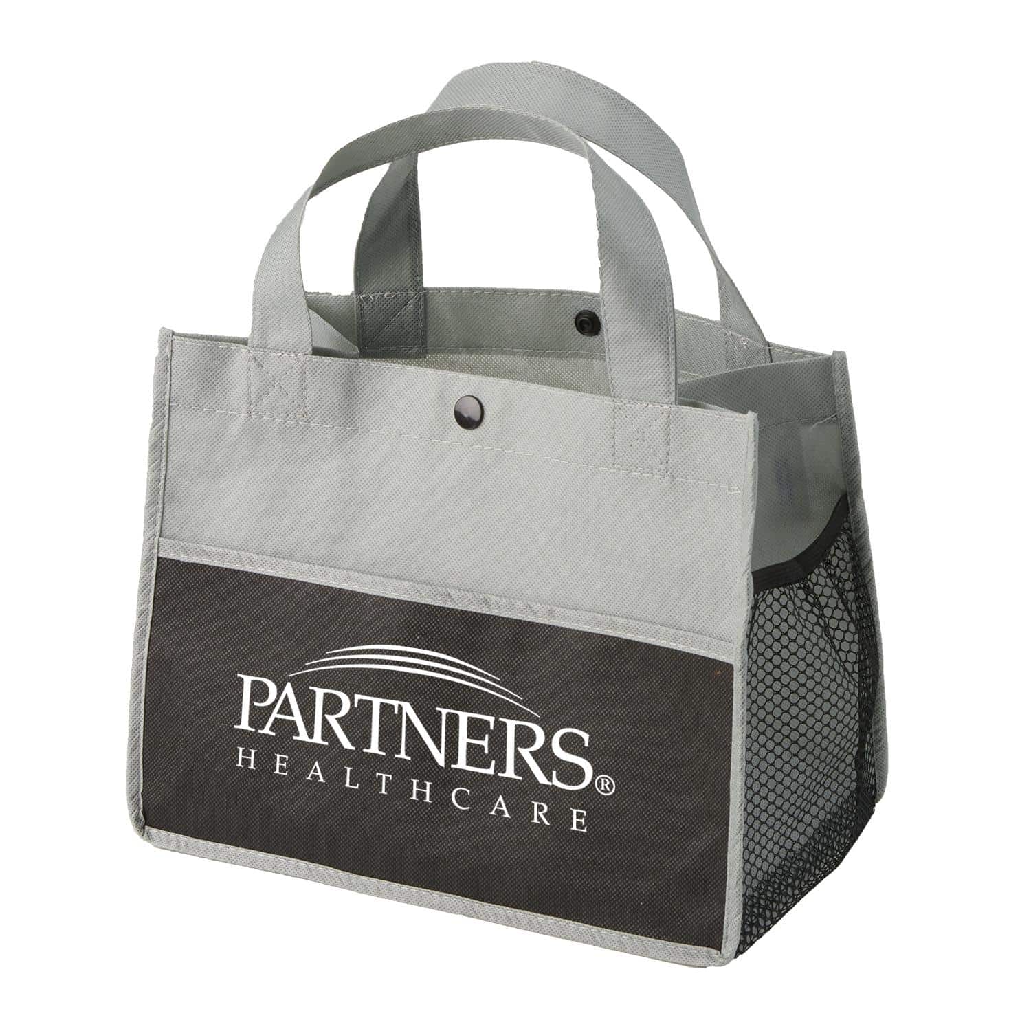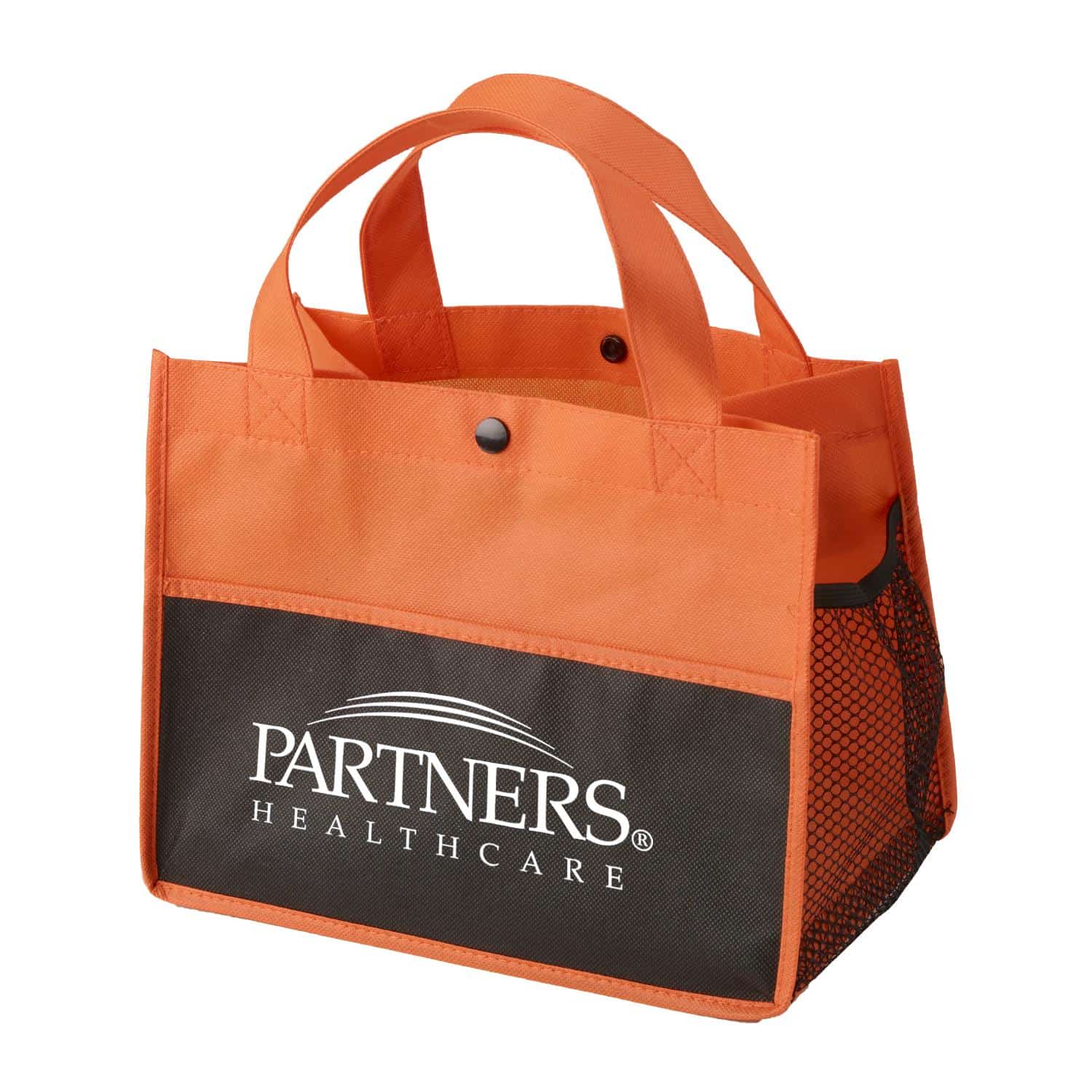 Constructed of 80 GSM non-woven polypropylene. Two-tone design with a large main compartment and a snap closure. Features a long front pocket and two elastic side mesh pockets. Reinforced 13″ handles and 6″ gusset. Not insulated. Complies with Prop 65. 11″ W x 8 1/2″ H x 6″ D