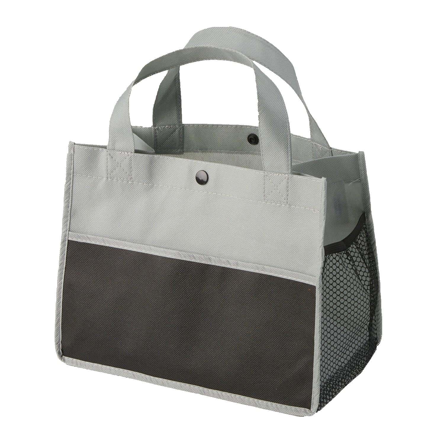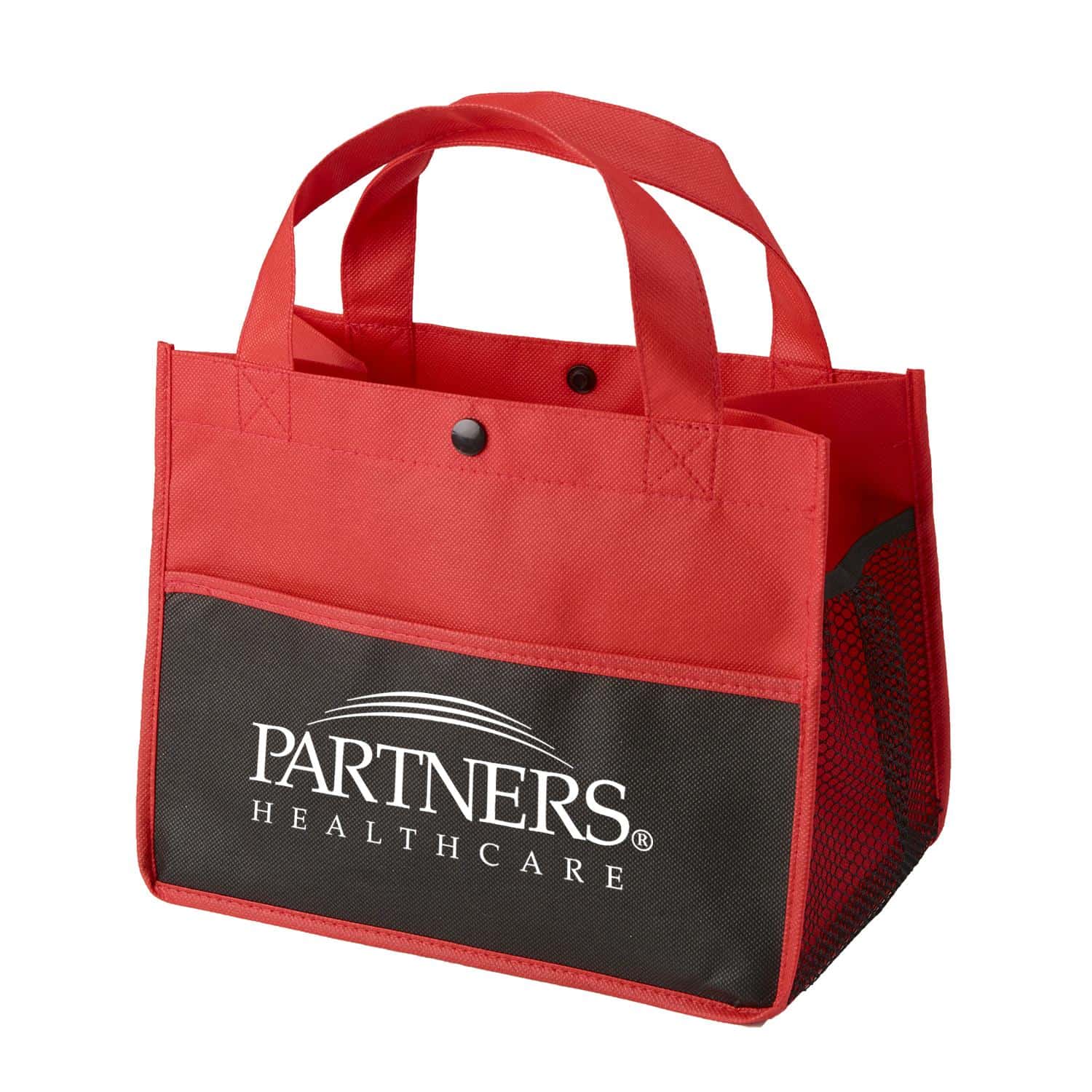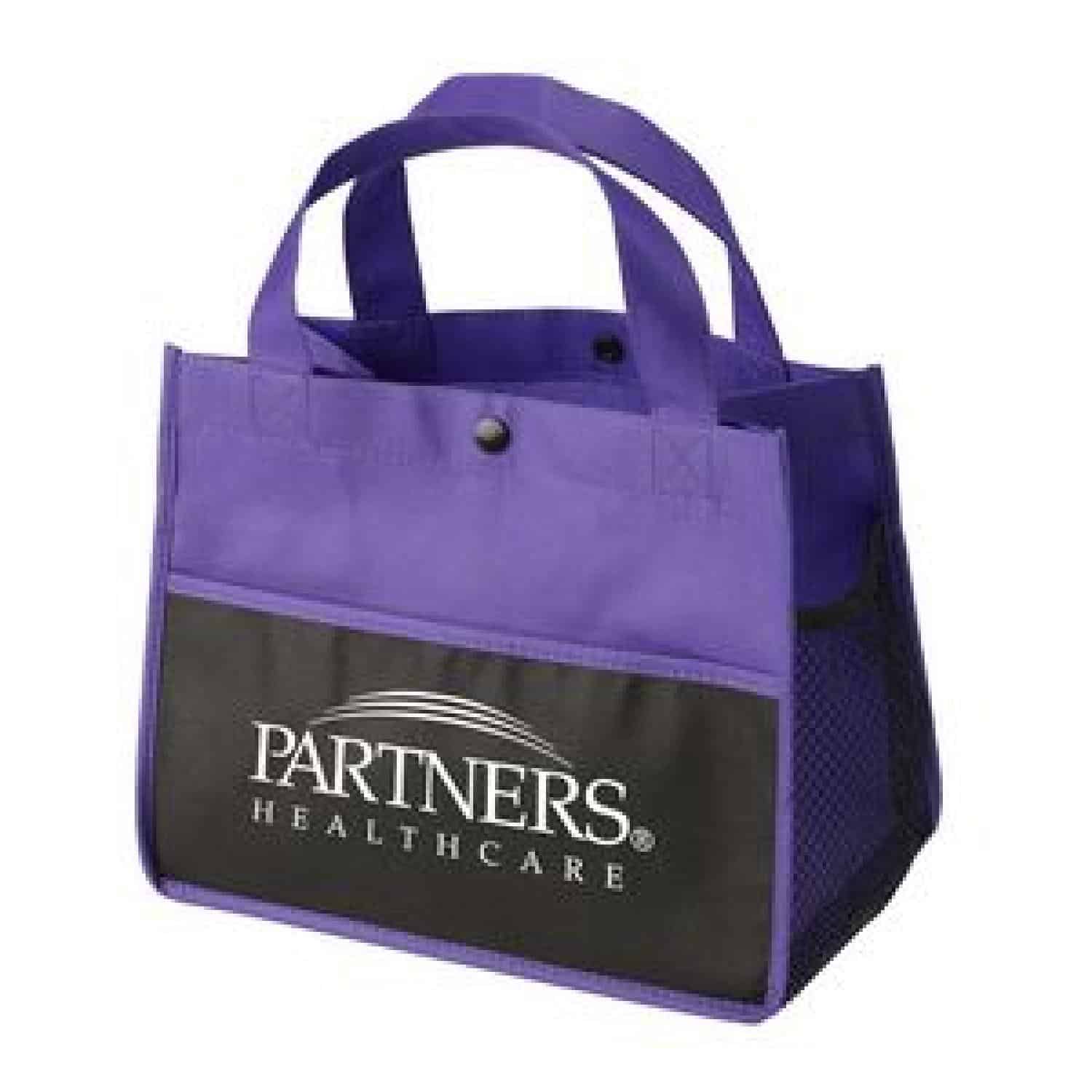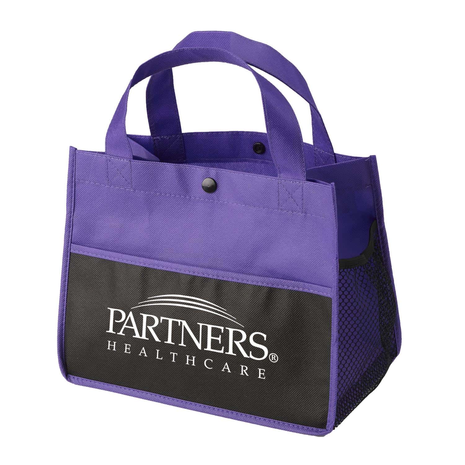 Constructed of 80 GSM non-woven polypropylene. Two-tone design with a large main compartment and a snap closure. Features a long front pocket and two elastic side mesh pockets. Reinforced 13″ handles and 6″ gusset. Not insulated. Complies with Prop 65. 11″ W x 8 1/2″ H x 6″ D
