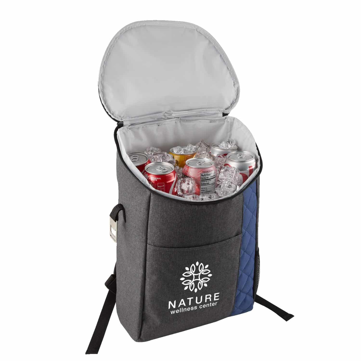 This backpack style cooler tote is constructed of 300D heatherd polyester & a quilted pattern 600D polyester. Backpack features a zippered closure main compartment & zippered pocket on flap. Comes with a pocket on front & an external mesh pocket for holding a bottle. Contains PEVA insulated inside lining for keeping food/drinks cool and also comes with a hanging bottle opener on the side. Adjustable padded shoulder straps and a top carrying handle means easy to both carry, wear and transport. 17″ H x 11 3/4″ W x 5″ D
