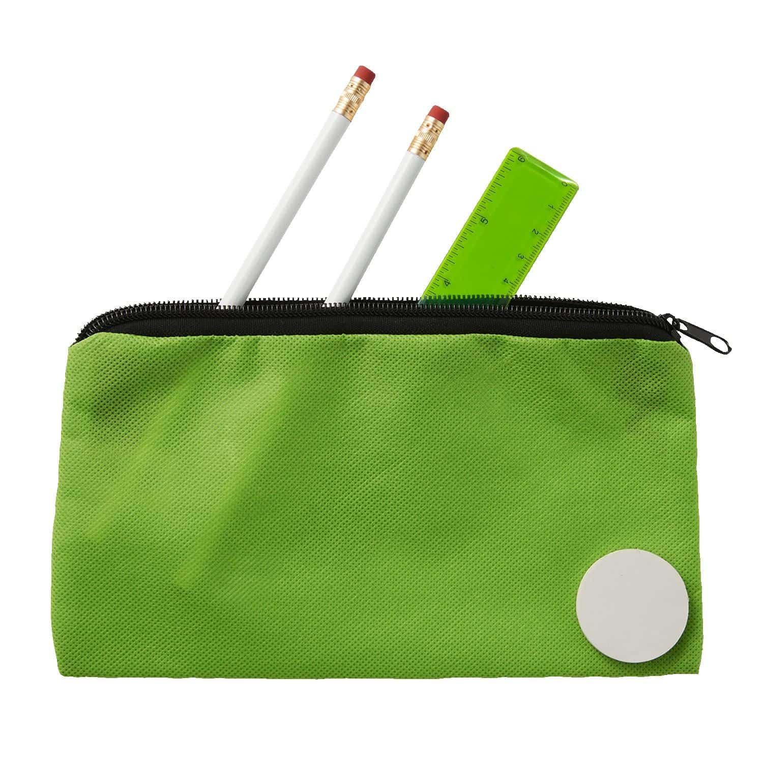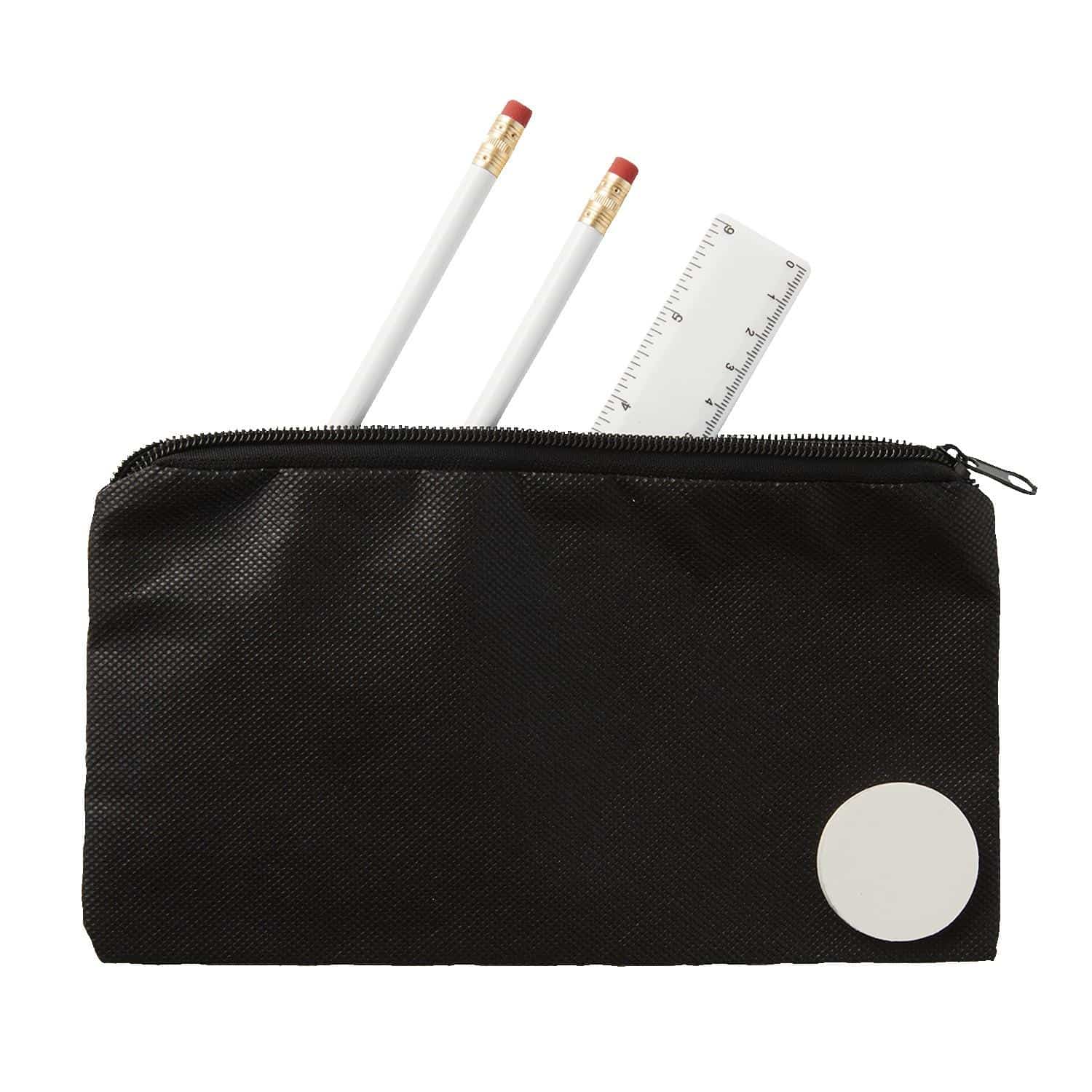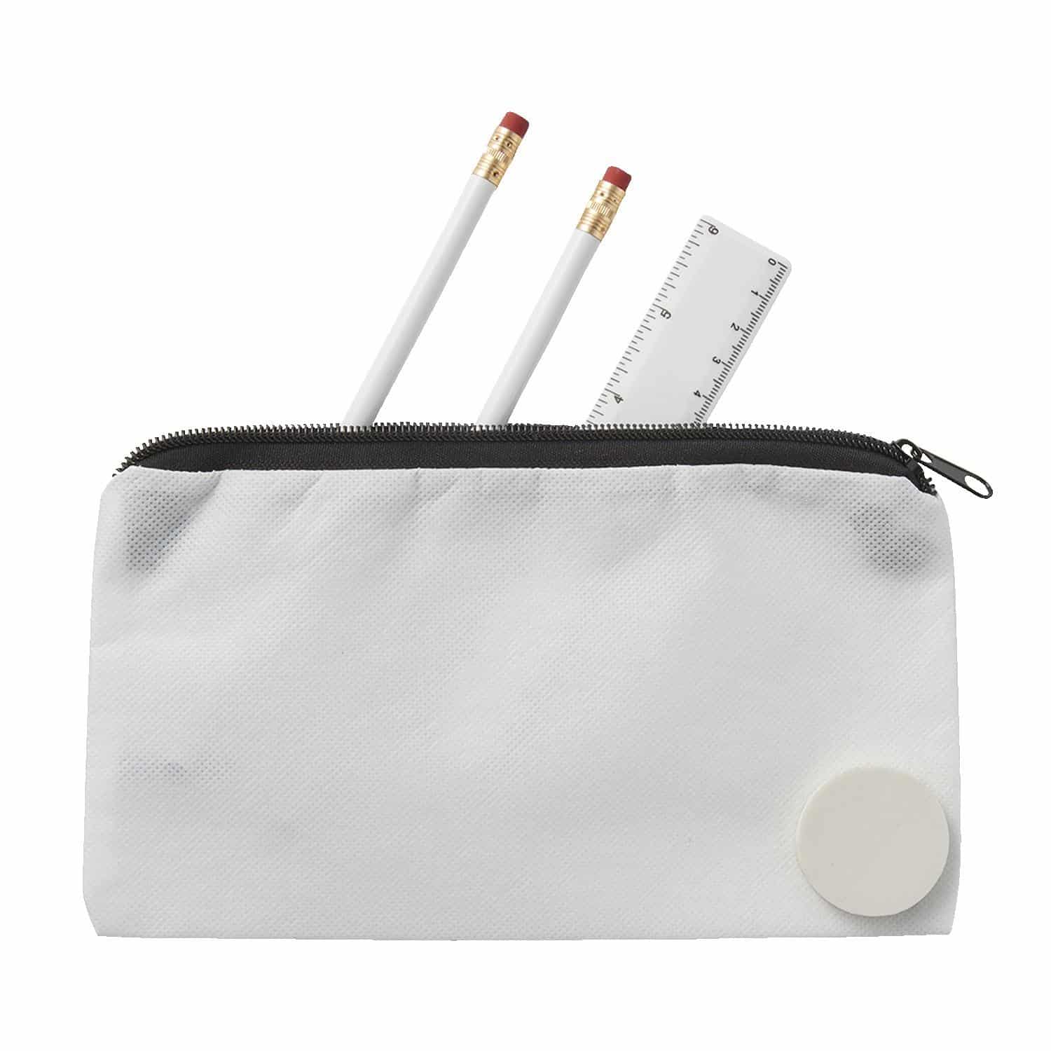 This school kit includes a pouch that contains two white round wooden #2 pencils, a white round eraser, and a 6″ plastic ruler. Additional 3″x7″ heat transfer imprint on pouch, 3/8″x4″ imprint on ruler, and 1″ diameter imprint on eraser available. 5″ H x 9″ W