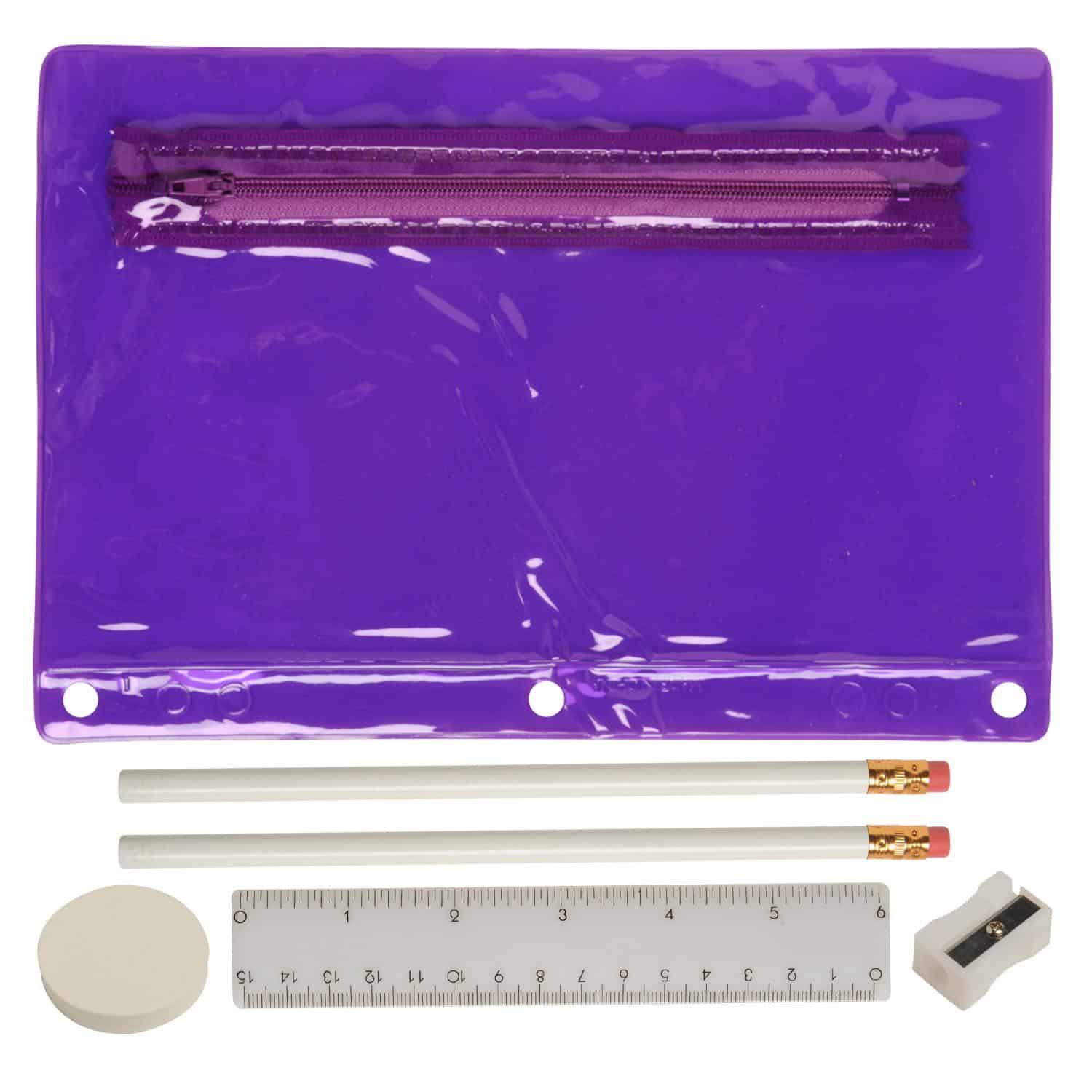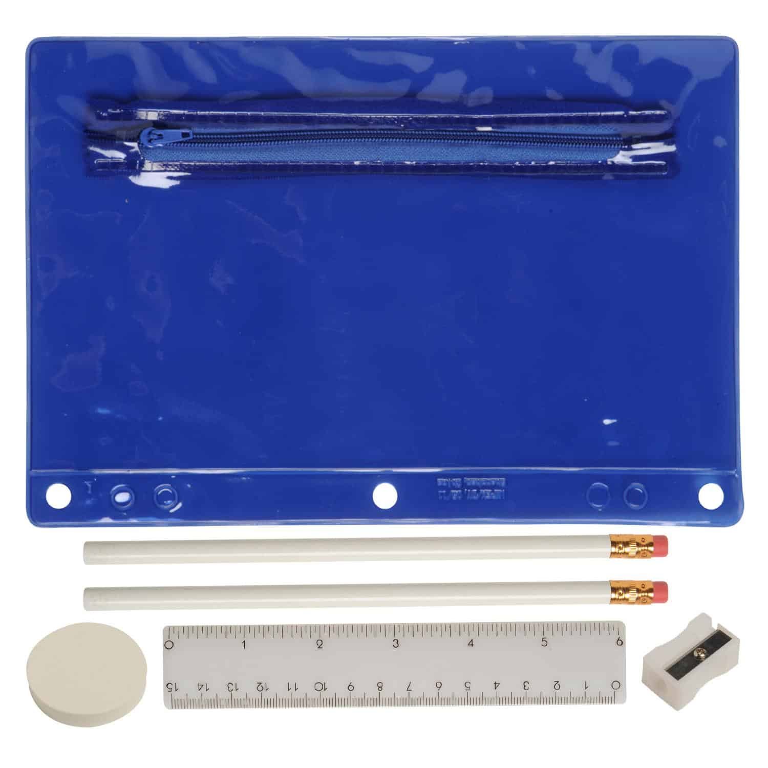 Includes 2 White Jo-Bee Miser Round Pencils, 1 White Jo-Bee Round Eraser without imprint. 1 White Jo-Bee 6″ Plastic Ruler, 1 White pencil sharpener without imprint. 6 1/4″ W x 9 1/4″ H