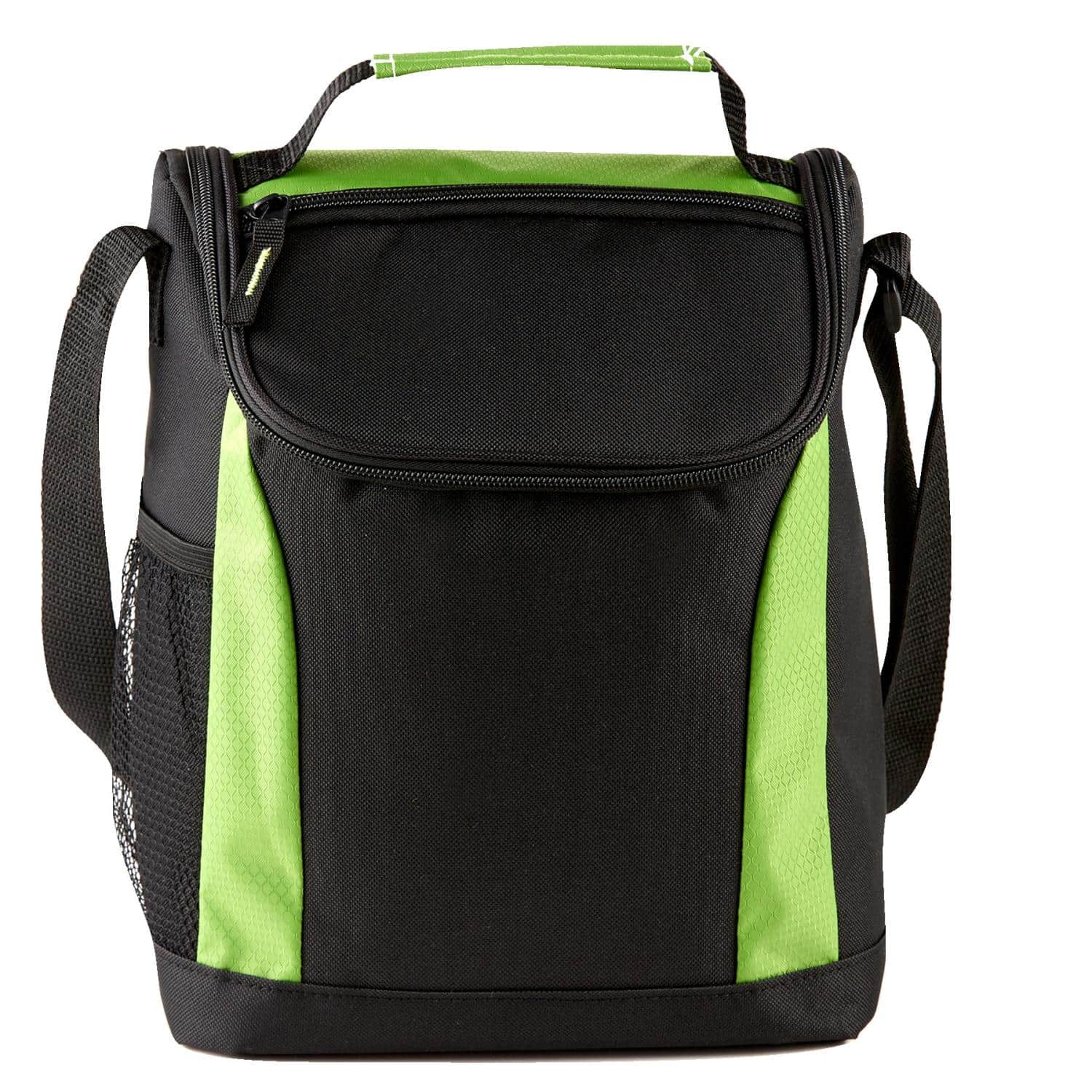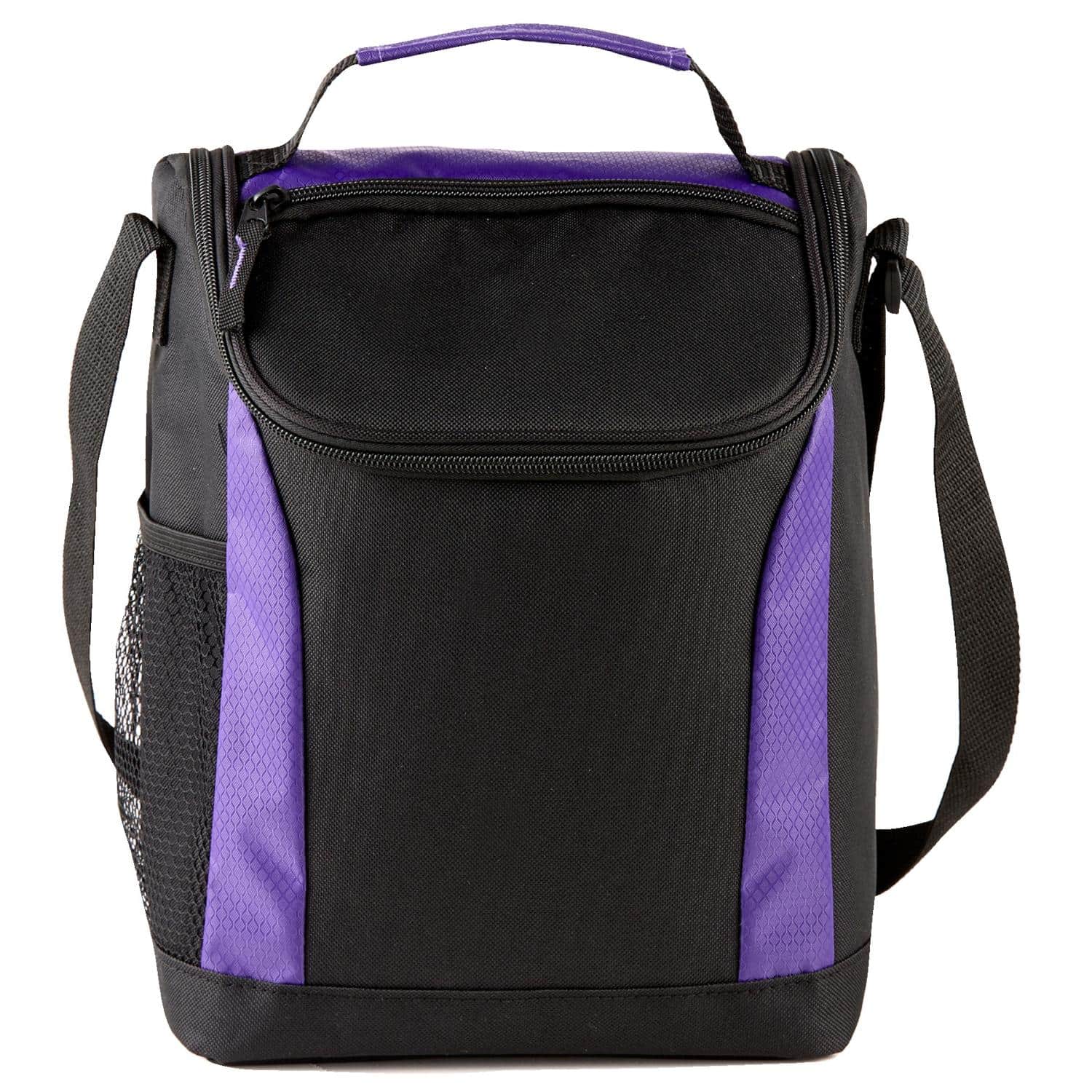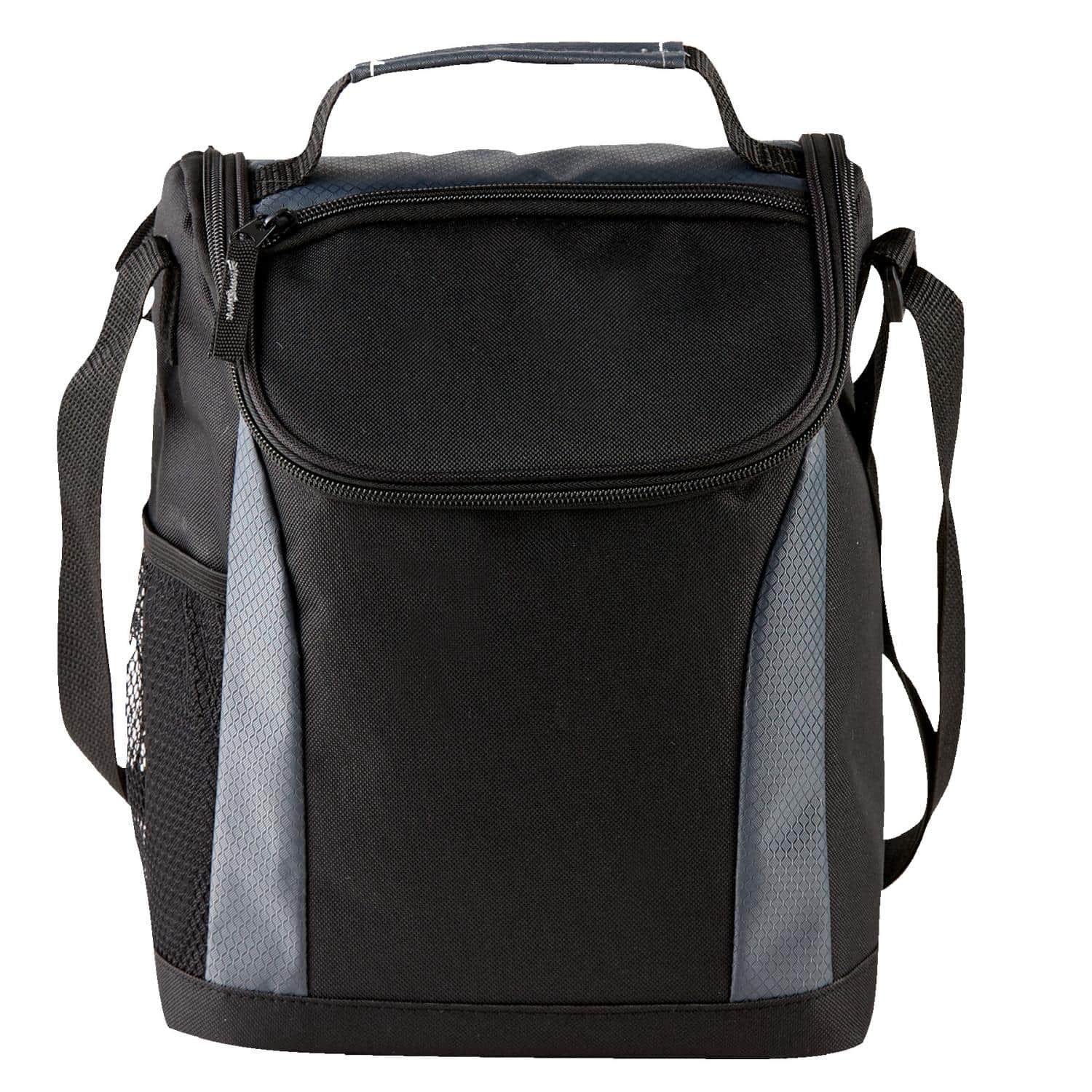 This cooler lunch bag is constructed of 600D polyester & ripstop and features a main compartment with a double zipper closure and 4 mil foam PEVA insulated inside lining for keeping food/drinks cool, contains handle strap and adjustable shoulder strap on top, and includes front pocket for easy storage and a side mesh pocket for your favorite drink. 11 1/4″ H x 9″ W x 6 1/4″ D