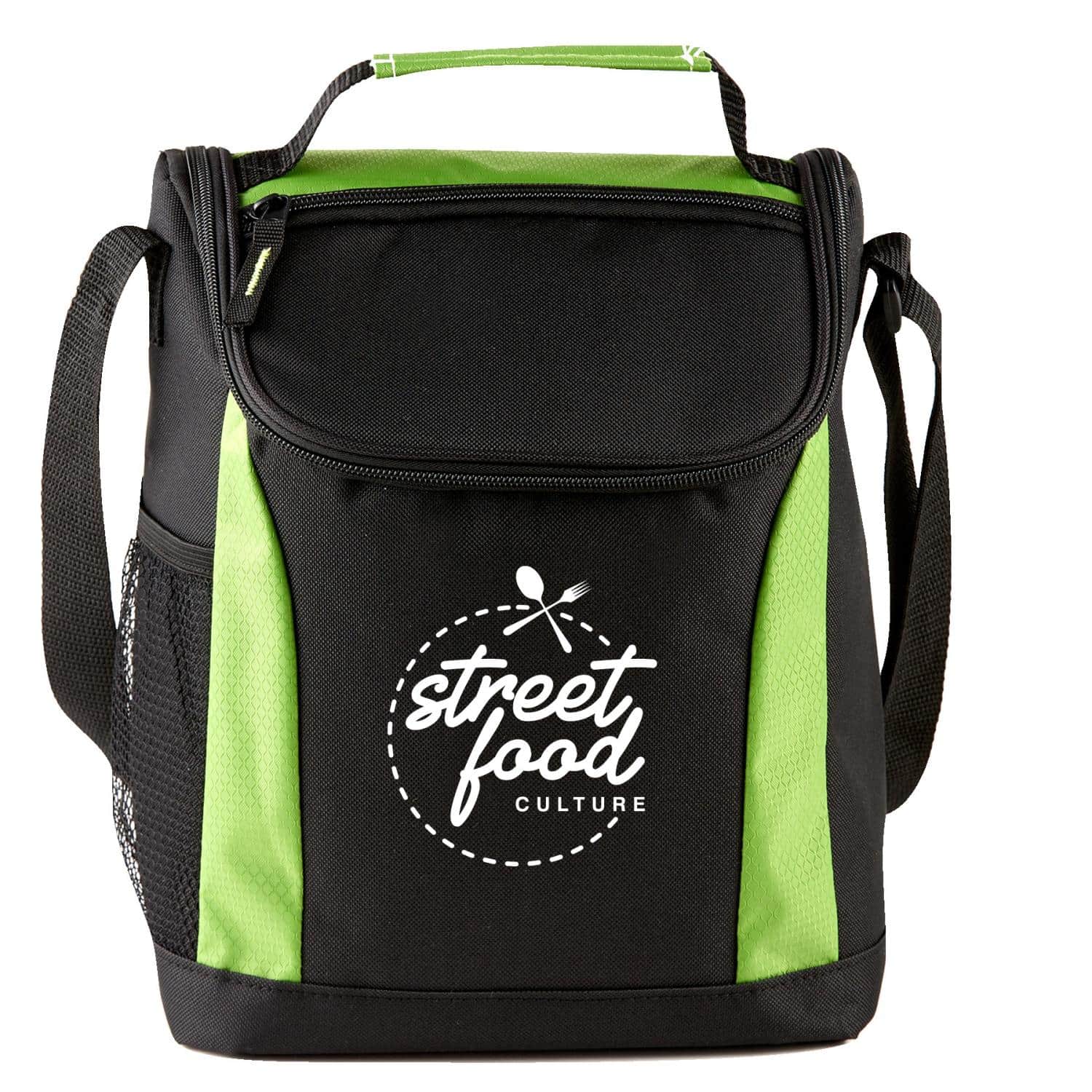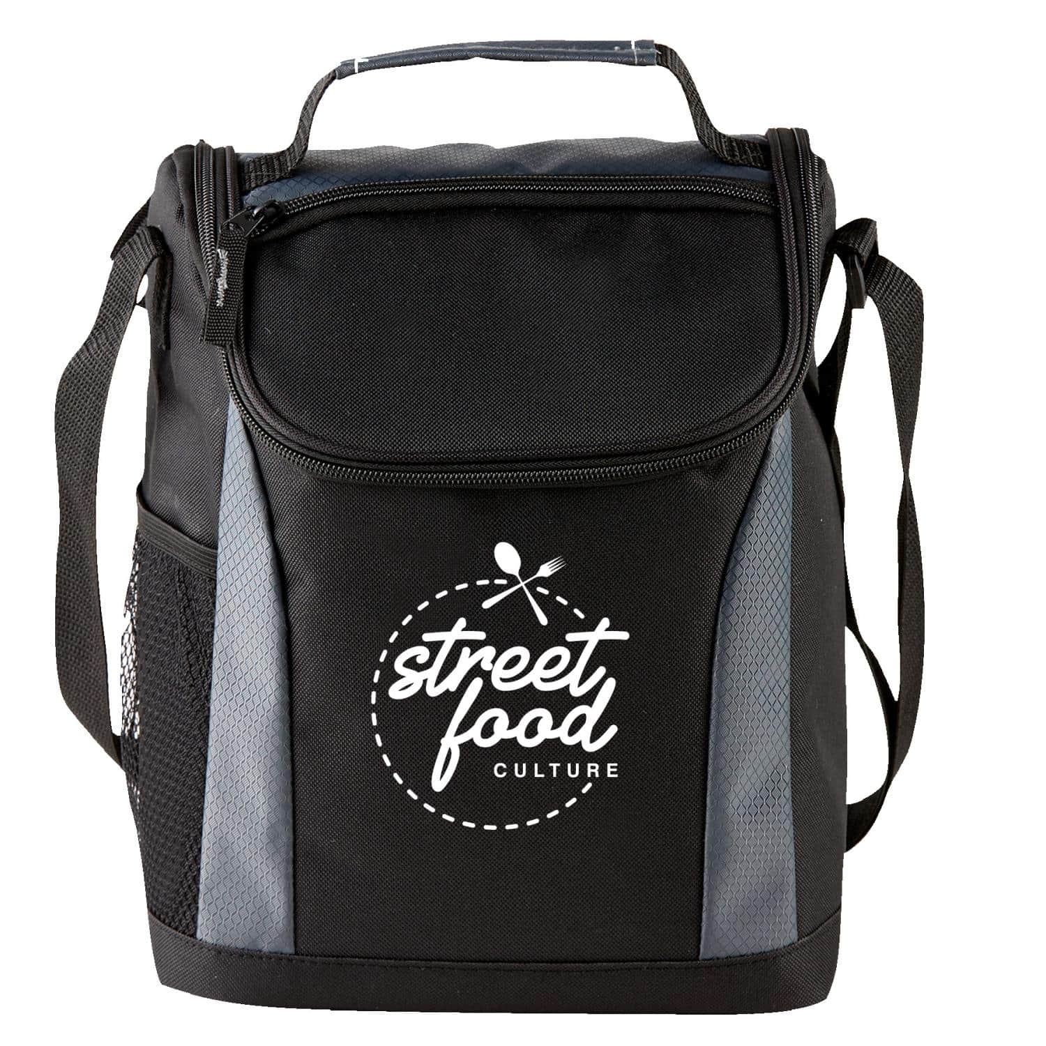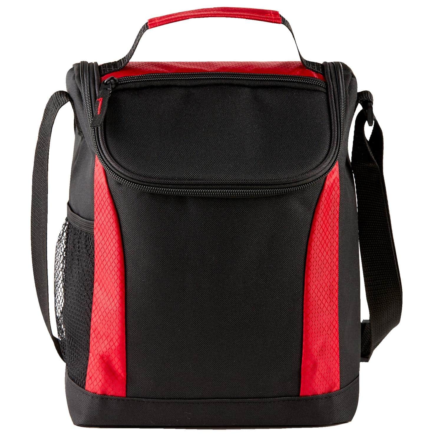 This cooler lunch bag is constructed of 600D polyester & ripstop and features a main compartment with a double zipper closure and 4 mil foam PEVA insulated inside lining for keeping food/drinks cool, contains handle strap and adjustable shoulder strap on top, and includes front pocket for easy storage and a side mesh pocket for your favorite drink. 11 1/4″ H x 9″ W x 6 1/4″ D