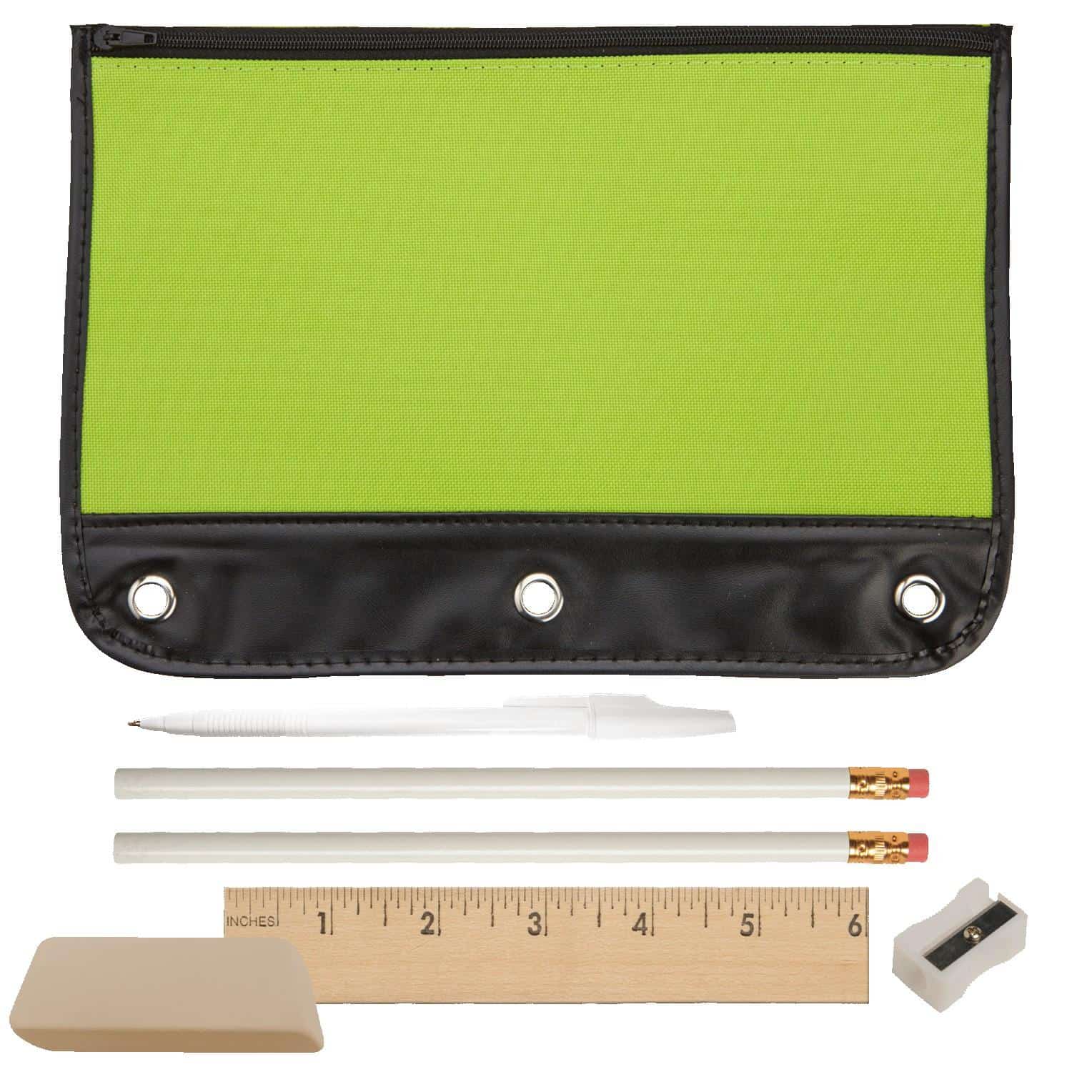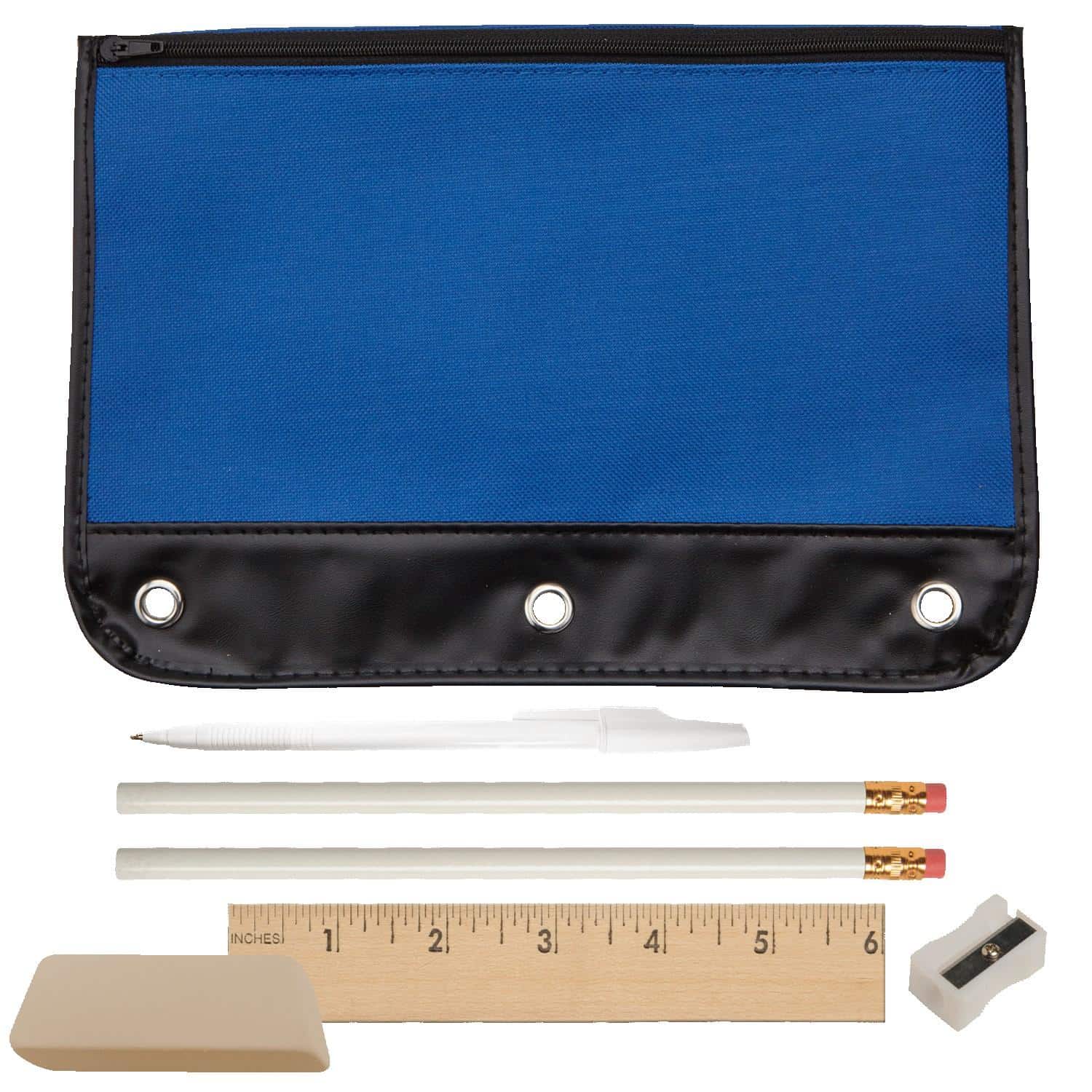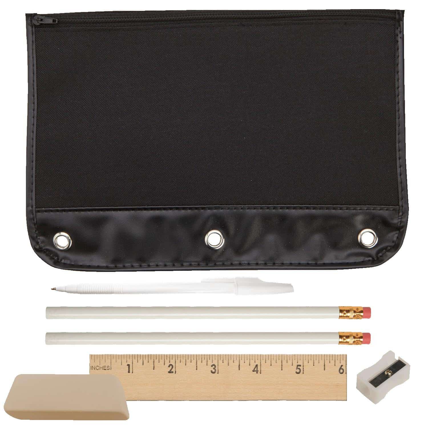 Constructed of 600D polyester. Features zipper pouch, reinforced metal holes and fits most standard 3-ring binders. Adheres to CPSIA guidelines and marking requirements. Includes two black white 7900 Jo-Miser Round Pencils, a blank white 7000 Competitor Stick Pen, a jumbo eraser, a 6″ wooden ruler and a pencil sharpener. 7 1/4″ H x 10 1/2″ W