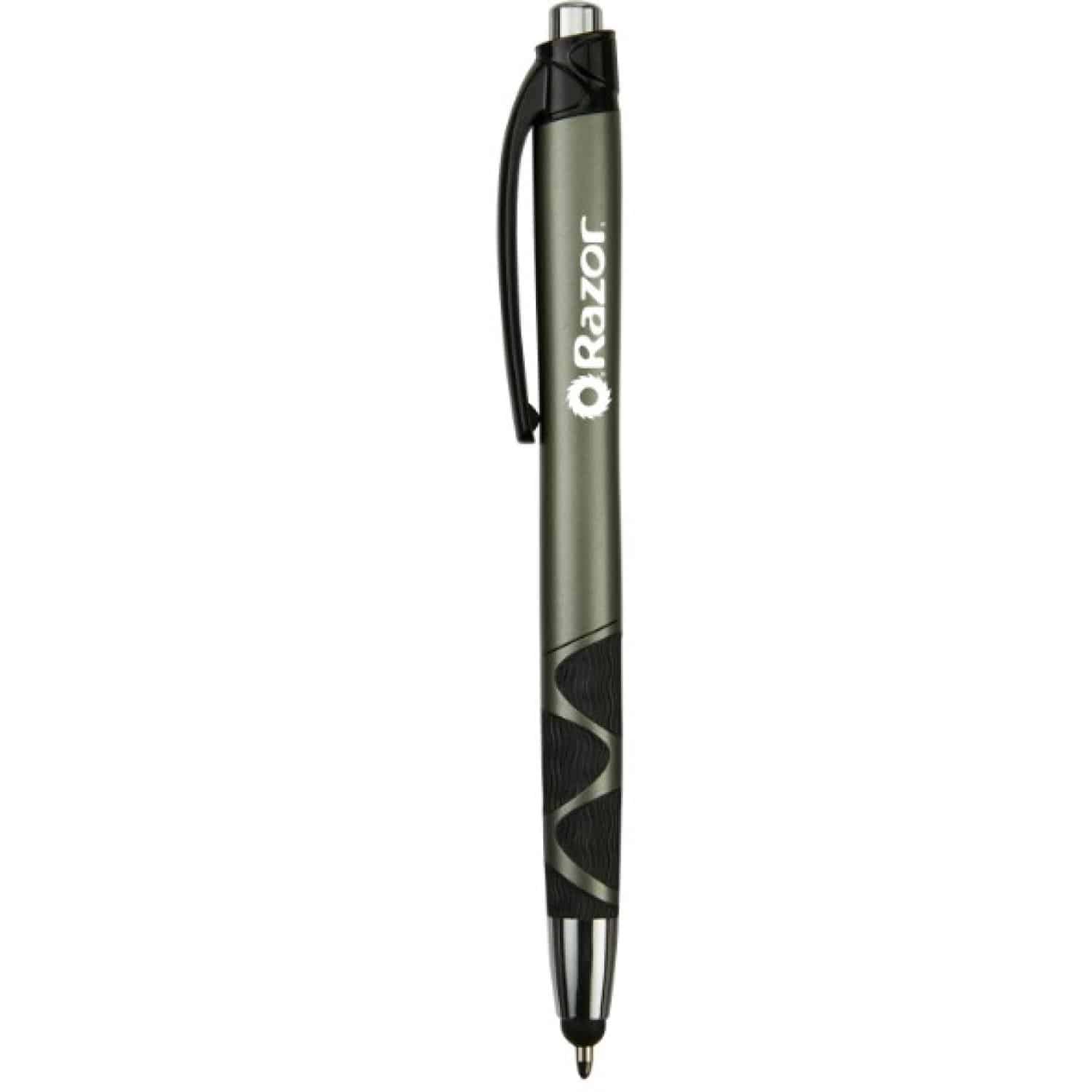 Plunge action retractable ballpoint pen. Responsive capacitive stylus. Matte metallic colored barrel. Chrome ferrule and plunger. Unique wavy rubberized grip. Black medium point. High-quality Glide-Writeâ„¢ ink. 5 3/4″ H x 7/16″ Diameter