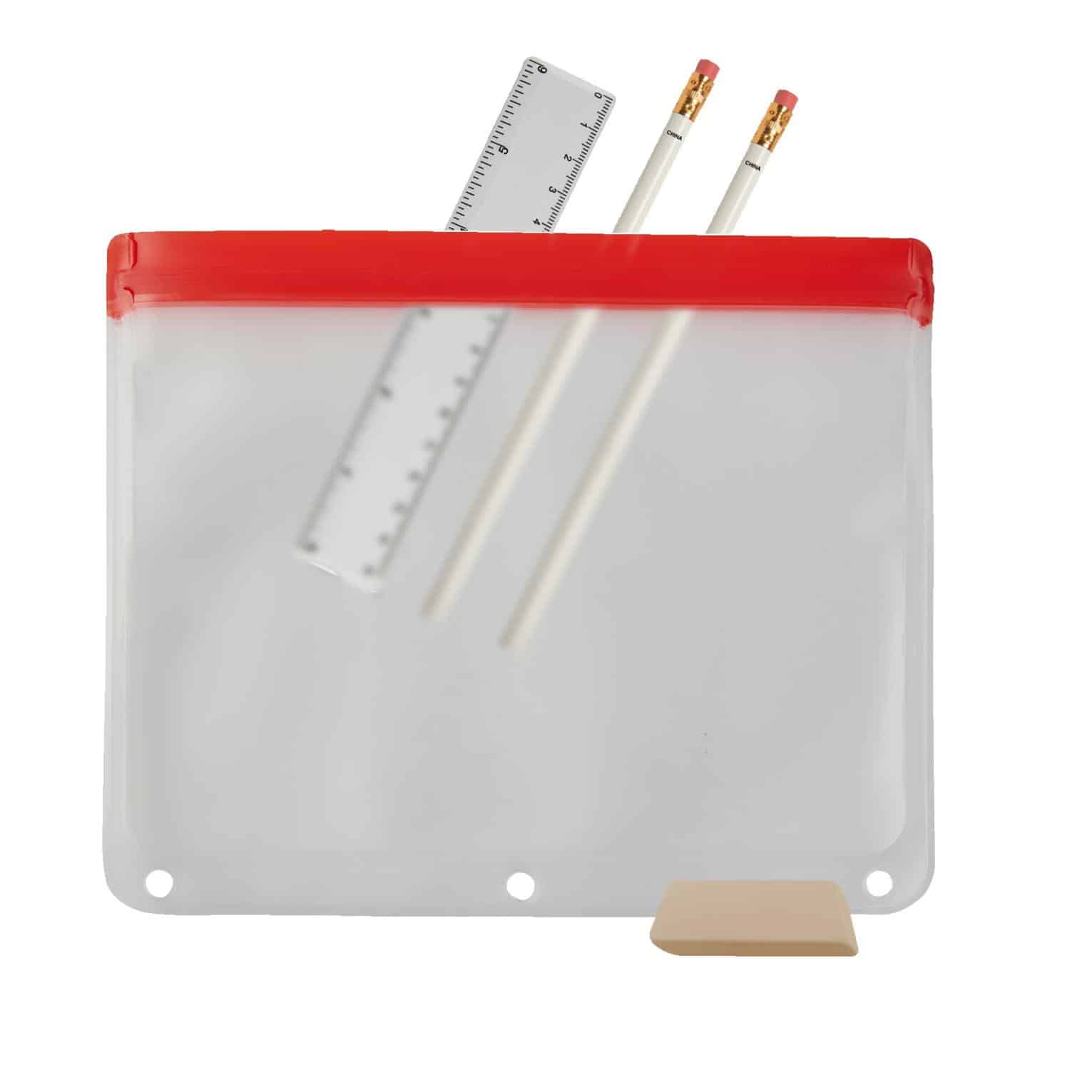 Reusable and washable, this school kit features a PEVA pouch with a ziplock closure on top. Pouch can fit into three ring binder and ncludes : 2 White Pens, a White Jumbo Eraser and a 6″ Plastic Ruler (all content items are blank) White ink/imprint not available. CPSIA Compliant. 8 1/16″ H x 9 3/4″ W